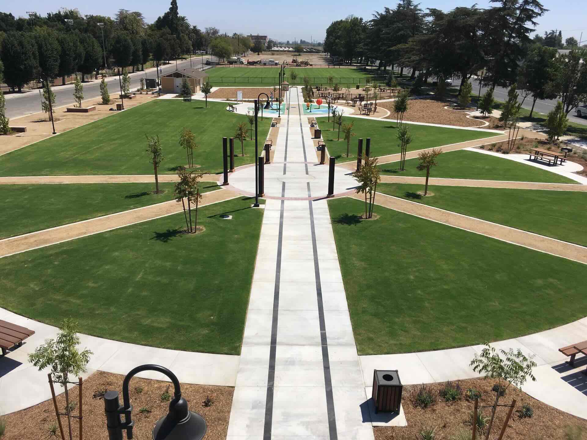 City Heritage Park, located in Parlier, California, transformed a historic site once home to fruit packing warehouses and railroad lines into a vibrant community space. After addressing significant challenges—including the removal and safe off-haul of over 11,000 tons of contaminated soil—the project began in October 2018. The park features a central walkway inspired by railroad tracks, a splash pad with a water tower and warning lights, classic benches, a farmer’s market area, and future amenities like shade pavilions and playgrounds. Landscaping includes a soccer field, native California plants, and a variety of shade trees, creating a welcoming environment for the community and future generations.